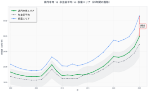 - 杉並区平均(グレー線)と比べても、高円寺は「少し高め」程度